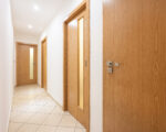 Dlouhá vstupní chodba s vestavěnou skříní rozděluje byt na společenskou a klidovou část. Kuchyně má i separátní jídelní část. Dalšími místnostmi jsou velký obývací pokoj a dvě ložnice.