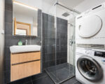 Koupelna s toaletou je prostorná s velkým sprchovým koutem. Je zde také umístěna pračka se sušičkou.