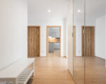 Vstupní chodba bytu je vybavena šatní skříní. Je zde i dostatek místa na botník a odkládání obuvi. Velkoformátové zrcadlo prostor opticky zvětšuje a prosvětluje. Chodba je centrem celého bytu, z níž se vstupuje do jednotlivých neprůchozích pokojů a koupelny.